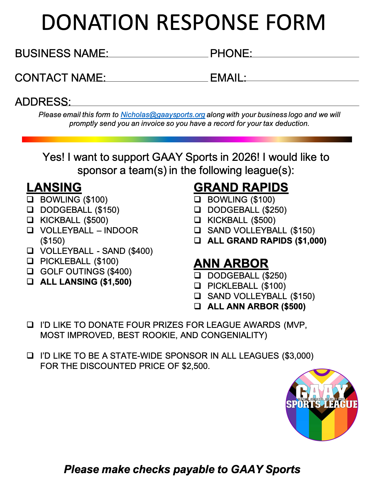 Interested in sponsoring a team in one of our leagues? Here is the 2026 information, or you can download the entire sponsor packet below and see how sponsoring a team can be mutually beneficial for both your business and GAAY Sports! We are a 501c3 non-profit charity, so 100% of your donation is tax deductable! If you have any questions, email nicholas@gaaysports.org!