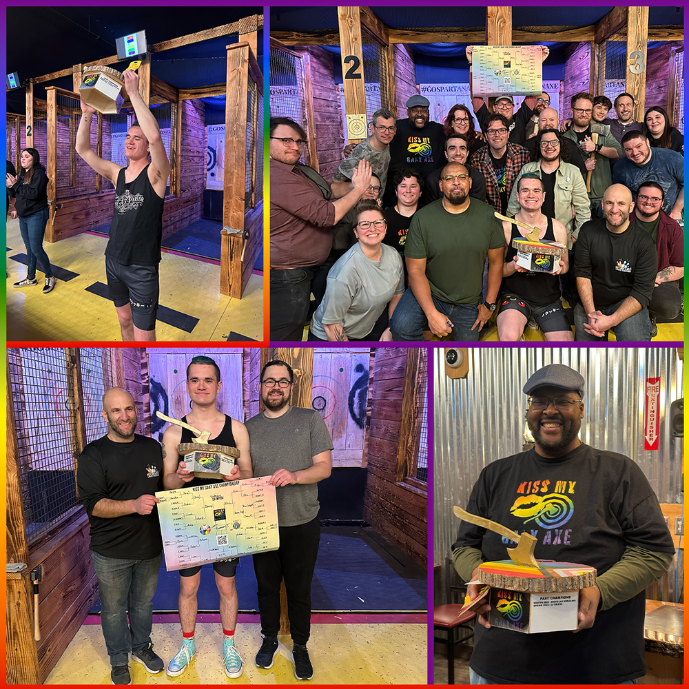 It was a record-setting season as 40 participants competed for the Kiss My GAAY Axe Championship this season. Players completed 28 regular season matches over the first 7 weeks. Then on the 8th week, players were seeded in order of their regular season finish for a winner-take-all double elimination tournament. In the end, one player finished the evening with a win and the title. Congratulations to JJ Snook for taking home the championship for the 2nd time! Eric Miller was runner-up and Nicholas Wendling finished 3rd.