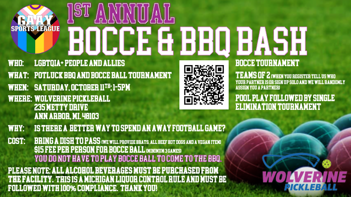 ABSOLUTELY! This is first and foremost, an LGBTQIA+ BBQ for people in the greater Ann Arbor/Ypsi area (and anyone who wants to drive, honestly). The bocce ball tournament is just a fun way to utilize another part of this amazing facility at Wolverine Pickleball. They have been amazing partners to us, and we want everyone to know what an awesome space they have!