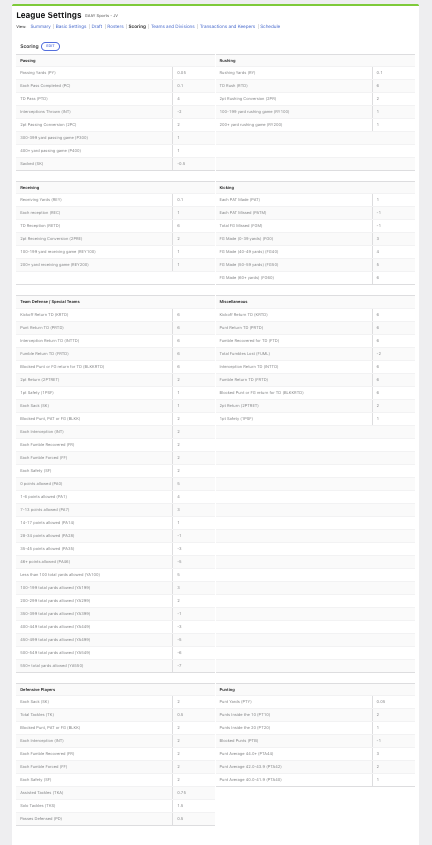 Build your team on draft day and see if you can outwit everyone else on game day. Manage your team through injuries, bye weeks, and performance letdowns as you face each participant head-to-head. Below you will find all the scoring details for the league, including roster sizes. The draft is on Labor Day at 7 pm. Rosters include some individual defensive players as well as the traditional offense.
